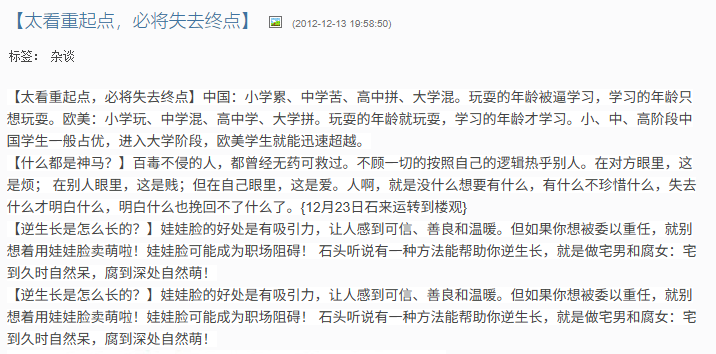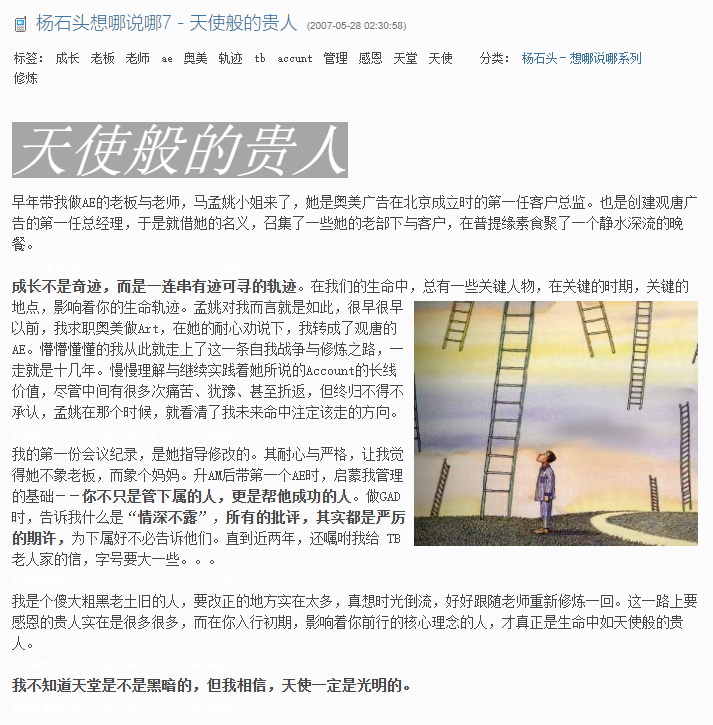 所以我需要自己训练普通话,那时候在"职来职往"看到杨石头,我觉得这是非常厉害的老师,我在网上搜到了他的新浪博客,所以杨石头的博客就成了我的普通话训练语料,每天晚上下课吃完饭后,回到家里都读一篇 石头哥 的博客文章,刻在脑子里。